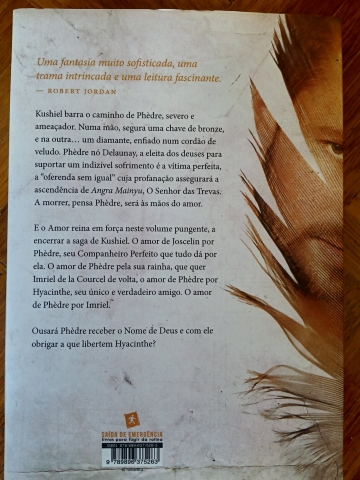 E o Amor reina em força neste volume pungente, a encerrar a saga de Kushiel. O amor de Joscelin por Phèdre, seu Companheiro Perfeito que tudo dá por ela. O amor de Phèdre pela sua rainha, que quer Imriel de la Courcel de volta, o amor de Phèdre por Hyacinthe, seu único e verdadeiro amigo, por toda a eternidade condenado ao cativeiro como Senhor do Estreito. O amor de Phèdre por Imriel, apenas amor simples e destituído de adornos. O Lungo Drom de Phèdre e Joscelin continua, por um lendário rio abaixo até uma terra esquecida de todo o mundo. E até um poder tão imenso que ninguém ousa proferir o seu nome.