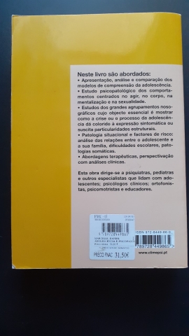 Neste livro são abordados: • Apresentação, análise e comparação dos modelos de compreensão da adolescência. • Estudo psicopatológico dos comportamentos centrados no agir, no corpo, na mentalização e na sexualidade. • Estudos dos grandes agrupamentos nosográficos cujo objecto essencial é mostrar como a crise ou o processo da adolescência dá colorido à expressão sintomática ou suscita particularidades estruturais. • Patologia situacional e factores de risco: análise das relações entre o adolescente e a sua família, dificuldades escolares, patologias somáticas. • Abordagens terapêuticas, perspectivação com análises clínicas. Esta obra dirige-se a psiquiatras, pediatras e outros especialistas que lidam com adolescentes; psicólogos clínicos; ortofonistas, psicomotristas, educadores, professores, pedagogos, técnicos de reinserção social e enfermeiros.
