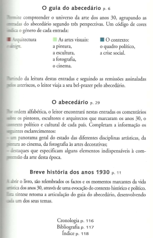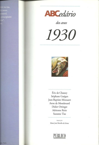 ABCEDÁRIO DOS ANOS 30. *** Éric de Chassey – Stéphane Guégan – Jean-Baptiste Minnaert – Anne de Mondenard – Didier Ottinger – Adrienne Reitz – Suzanne Tise *** Tradução: Maria José Metello de Seixas *** Coordenação Geral: Gabriela Fernandes *** [Sem ind. de local]: Edição Portuguesa da Reborn em exclusivo para o jornal Público, [Sem ind. de ano: 2003 (?) – data do Depósito Legal]. Colecção: ABCedário; Série Arte – 30. (22 x 12 cm.) com 119 + [1] pp. Profusamente ilustrado a cores. Capa flexível, com badanas. Bom exemplar. Capa com pequenas marcas de manuseamento e um ligeiro desgaste nas margens, encontrando-se, de um modo geral, em bom estado e limpa. Páginas bem conservadas e limpas. *** Provável primeira edição portuguesa desta obra que procura divulgar, de maneira acessível, o essencial sobre o universo da arte dos anos 30 do século XX. Impresso em bom papel. *** Portes: envio gratuito em correio normal (tarifa especial para livros) * envio em correio registado: 1,70