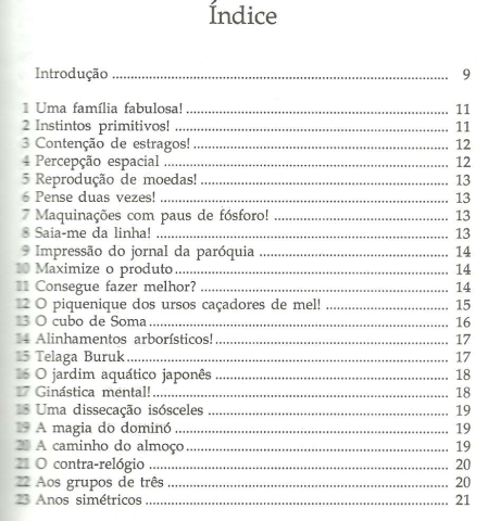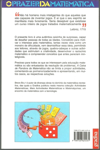 A CAIXA DE PANDORA DA MATEMÁTICA. *** Brian Bolt *** Título original inglês: A Mathematical Pandora’s Box *** Tradução: José Luís Malaquias *** Lisboa: Gradiva – Publicações, L.da, 1996. Colecção: O Prazer da Matemática – 19. (23 x 15 cm.) com 134 + [2] pp. Com várias ilustrações a p/b.. Capa flexível. Bom exemplar. Capa com pequenas marcas de manuseamento, alguns discretos vincos de pressão e um ligeiro desgaste nas margens, mas, de um modo geral, ainda em bom estado e limpa. Páginas bem conservadas e limpas. *** Primeira edição portuguesa deste livro que procura facilitar, de forma lúdica, uma aproximação à matemática, muitas vezes vista como demasiado complexa ou mesmo inacessível. Lê-se na contracapa. «O presente livro é uma autêntica caixinha de surpresas, capaz de desafiar as pessoas de todas as idades. Concebido para motivar o interesse pela matemática, tantas vezes vista como um monstro de dificuldade, vem desmistificar essa ideia, permitindo aos leitores, através de jogos, quebra-cabeças e outras actividades que estimulam a criatividade, desenvolver o raciocínio matemático e compreender conceitos que antes pareciam ininteligíveis. Precioso para todos os que se interessam pela educação matemática ou são entusiastas da resolução de problemas, A Caixa de Pandora da Matemática não se limita a propor actividades, comentando-as pormenorizadamente e apresentando, em muitos casos, as respectivas soluções.» (Na imagem 4 está apenas o começo do índice, que é bastante extenso, ocupando quatro páginas). *** Portes: envio gratuito em correio normal (tarifa especial para livros) * envio em correio registado: 1,70