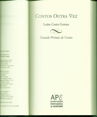 CONTOS OUTRA VEZ. *** Luísa Costa Gomes *** [Lisboa]: Associação Portuguesa de Escritores, 2001. Colecção: Biblioteca Prestígio - 1. (21 x 12,5 cm.) com 158 + [2] pp. Capa dura. Bom exemplar. Capa com pequenas marcas de manuseamento, encontrando-se globalmente em bom estado e limpa. Páginas bem conservadas e limpas. *** Obra distinguida com o Grande Prémio de Conto da Associação Portuguesa de Escritores, reúne contos escritos pela Autora entre 1984 e 1997, datando a edição original de 1997 . (Índice na imagem 4). *** Portes: envio gratuito em correio normal (tarifa especial para livros) * envio em correio registado: 1,70