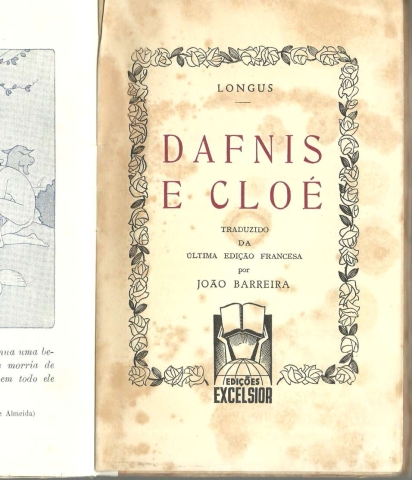 DAFNIS E CLOÉ. *** Longus *** Traduzido da última edição francesa por João Barreira *** Lisboa: Edições Excelsior, [Sem ind. de ano: provavelmente da década de 1940 ou 1950]. Colecção: Os 7 mais Belos Romances de Amor. (19 x 12,5 cm.) com 157 + [3] pp. + uma folha com uma ilustração (desenho de Álvaro Duarte de Almeida). Capa flexível. Exemplar razoável. Capa com marcas de manuseamento, pequenas manchas e um pouco gasta nas margens e na lombada, onde apresenta mesmo algumas esfoladelas. Apesar de um pouco envelhecida, de um modo geral, está ainda bastante apresentável. Páginas em relativo bom estado, embora se encontrem um pouco amarelecidas e apresentem manchas de acidez, especialmente importantes e concentradas nas contíguas à folha com a ilustração (impressa num papel diferente). *** Primeira edição da tradução de João Barreira deste grande clássico da literatura universal, considerado «a primeira narrativa conhecida do tipo literário a que mais tarde se deu o nome de romance.» Escreve o tradutor, a propósito desta obra, que «a ingenuidade das suas expressões, de uma tão cativante simplicidade, brotando como linfa pura na aurora do sentimento erótico, fazem perdoar-lhe por espontâneas as audácias realistas que desabrocham com a frescura natural de um cálice de flor.» *** Portes: envio em correio normal (tarifa especial para livros) * envio em correio registado: 1,70