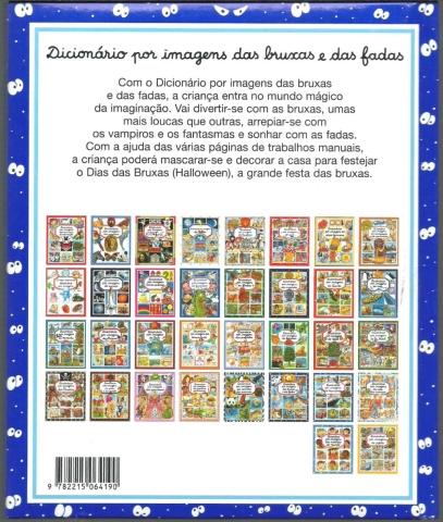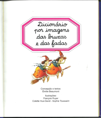 DICIONÁRIO POR IMAGENS DAS BRUXAS E DAS FADAS. *** Concepção e textos: Émilie Beaumont *** Ilustrações: François Ruyer – Colette Hus-David – Sophie Toussaint *** A história do Baile das Bruxas é da autoria de Jacqueline Pierre, os desenhos são de Gilles Scheid, coloridos por François Ruyer. *** Título original: L’imagerie des sorcières et des fées *** Tradução, adaptação e distribuição: Centralivros, Lda., Lisboa *** Tradução: Patrícia Palroz *** Fotocomposição: Maria da Graça Manta, Lisboa *** [Sem ind. de local]: Fleurus / Livros e Livros, 2009. (23 x 19 cm.) com 131 + [5] pp. (a numeração das páginas inclui as folhas que ficam coladas à parte de dentro daa capa e da contracapa). Profusamente ilustrado a cores. Capa dura, almofadada. Bom exemplar. Capa com ligeiras marcas de manuseamento e um pequeno desgaste nas extremidades da lombada e nos cantos exteriores, mas ainda em bom estado e limpa. Páginas bem conservadas e limpas. *** Trata-se, aparentemente, da reedição da primeira edição (de 2000) deste divertido e belamente ilustrado dicionário, destinado ao público infanto-juvenil, a propósito do qual se lê na contracapa: «Com o dicionário por imagens das bruxas e das fadas, a criança entra no mundo mágico da imaginação. Vai divertir-se com as bruxas, umas mais loucas que outras, arrepiar-se com os vampiros e os fantasmas e sonhar com as fadas. Com a ajuda das várias páginas de trabalhos manuais, a criança poderá mascarar-se e decorar a casa para festejar o Dia das Bruxas (Halloween), a grande festa das bruxas.» (Índice na imagem 4). *** Portes: envio gratuito em correio normal (tarifa especial para livros) * envio em correio registado: 1,70
