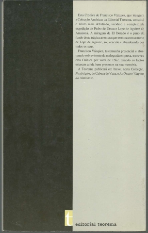 EL DORADO. *** Francisco Vázquez *** Tradução de Telma Costa *** Título original: El Dorado *** Lisboa: Editorial Teorema, Lda., [Sem ind. de ano: 1991 (?) – data do Depósito legal e do Copyright]. Colecção: Américas – [1]. (23,5 x 14,5 cm.) com 99 + [1] pp. Capa flexível. Exemplar razoável. Capa com marcas de manuseamento, alguns vincos discretos e um ligeiro desgaste nas margens e na lombada, mas de um modo geral, ainda em boas condições e limpa. Páginas globalmente bem conservadas e limpas, embora apresentem um ligeiro amarelecimento e um ou outro pontinho de acidez (raros). *** Presumível primeira edição portuguesa desta obra, sobre a qual se lê na contracapa: «Esta Crónica de Francisco Vázquez, que inaugura a Colecção Américas da Editorial Teorema, constitui o relato mais detalhado, verídico e completo da expedição de Pedro de Ursua e Lope de Aguirre ao Amazona[s]. A miragem de El Dorado é o pano de fundo desta trágica aventura que termina com a morte de Lope de Aguirre, só, vencido e abandonado por todos os seus. Francisco Vázquez, testemunha presencial e afortunado sobrevivente da malograda empresa, escreveu esta Crónica por volta de 1562, quando os factos estavam ainda bem presentes na sua memória.» (Índice na imagem 4). *** Portes: envio gratuito em correio normal (tarifa especial para livros) * envio em correio registado: 1,70