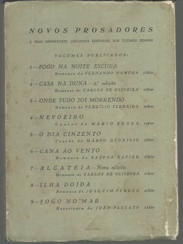 FOGO NO MAR. *** João Falcato *** [Coimbra]: Coimbra Editora, Limitada, 1945. Colecção: Novos Prosadores – 9. (19,5 x 14 cm.) com 178 + [2] pp. Capa flexível, com badanas. Exemplar razoável. Capa com evidentes marcas de uso, manchas (mais evidentes no lado de dentro e na contracapa), pequenas esfoladelas e um pouco gasta e amachucada nas margens e na lombada, que apresenta também vincos de abertura. Apesar de algo envelhecida e cansada, de um modo geral, está ainda apresentável. Páginas globalmente bem conservadas e limpas, embora apresentem um tom amarelecido e algumas pequenas manchas de acidez (pouco frequentes). *** Primeira edição deste “romance-reportagem” inspirado num episódio dramático vivido pelo próprio Autor. Em jeito de apresentação, escreve o Autor: «Esta é a história verdadeira da viagem do cargueiro “Mello”, que uma explosão inexplicável consumiu em fôgo nas águas sombrias do mar sem fim. Mais lágrimas silenciosas, avivando a dôr de muitos filhos que ficaram órfãos, de muitas mães que ficaram sem amparo, de muitas mulheres que ficaram viúvas, êste livro vai fazer cair nos seus rostos tocados pela desgraça. O sacrifício dêsses companheiros que encontraram a morte no incêndio do “Mello” ainda hoje pede, como no último olhar que me lançaram antes de deixarem a vida, que grite o espanto de serem vítimas, sem saber porquê, duma brutalidade que só tem paralelo na sua própria inutilidade.» Um dos volumes que integram a muito estimada colecção coimbrã “Novos Prosadores” que albergou alguns dos mais importantes nomes do nascente neo-realismo português, no campo da ficção. *** Portes: envio gratuito em correio normal (tarifa especial para livros) * envio em correio registado: 1,70