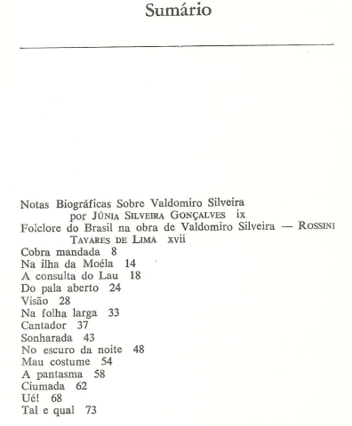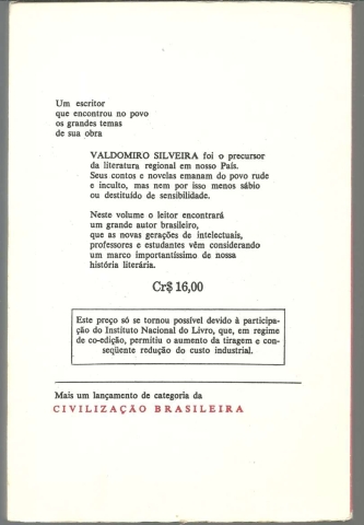 LERÉIAS. (Histórias contadas por eles mesmos). (Contos). *** Valdomiro Silveira *** Notas biográficas por Júnia Silveira Gonçalves *** Folclore do Brasil na obra de Valdomiro Silveira por Rossini Tavares de Lima *** Rio de Janeiro: Editora Civilização Brasileira S. A.; Brasília: Instituto Nacional do Livro – Ministério da Educação e Cultura, 1975. Coleção Vera Cruz (Literatura Brasileira) – 201. (21 x 14 cm.) com XXVII + [1] + 154 + [2] pp. Capa flexível. Bom exemplar. Capa com marcas de manuseamento, vincos ligeiros e um pouco gasta nas margens e na lombada, que se encontra também algo descolorida. Apesar de tudo, de um modo geral, está ainda em bom estado e limpa. Páginas bem conservadas e limpas. Tem uma pequena etiqueta de livraria colada na primeira página. *** Segunda edição desta obra póstuma do escritor brasileiro Valdomiro Silveira, publicada originalmente 30 anos antes, em 1945. Era provavelmente a obra preferida do Autor, que procurou escrevê-la utilizando o “dialecto caipira”, para melhor retratar o povo rude e inculto onde foi buscar inspiração para quase todas as suas criações literárias. É, por isso, geralmente considerado o precursor da literatura regional no Brasil. (Índice nas imagens 3 e 4). *** Portes: envio gratuito em correio normal (tarifa especial para livros) * envio em correio registado: 1,70