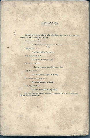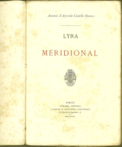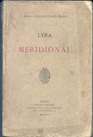 LYRA MERIDIONAL. *** Antonio d’Azevedo Castello Branco *** Porto: Livraria Central – Campos & Godinho – Editores, 1886. (19 x 12,5 cm.) com 343 + [1] pp. Capa flexível. Exemplar razoável. Capa com evidentes marcas de uso, manchada, empoeirada e bastante gasta nas margens e na lombada, que apresentam pequenos rasgões e mesmo a falta de vários pequenos pedaços de papel. O defeito mais grave é, ainda assim, a falta da contracapa. Páginas em relativo bom estado, mas amarelecidas e com pequenas manchas de acidez generalizadas, embora se concentrem mais nas primeiras e nas últimas. A última dezena de folhas apresenta alguns furinhos feitos pelo bicho junto da margem lateral, mas de reduzidas dimensões, com pouco impacto no aspecto geral e nunca atingindo a parte impressa. *** Primeira edição do primeiro e único livro de poemas publicado em vida por António de Azevedo Castelo Branco, sobrinho materno de Camilo Castelo Branco e que ao seu ilustre tio dedicou este livro, escrevendo a dado passo: «A maxima parte das composições que constituem o volume é allusiva á vida, costumes e á paizagem transmontana, e talvez n’isto se encerre o motivo, porque não dei a estes versos o destino inglorio que tiveram muitos outros, que talvez merecessem preferencia para a publicidade.» Por outro lado, quase em jeito de retribuição, este livro foi tema de um dos Serões de S. Miguel de Seide, de Camilo. O Autor, natural de Vilarinho de Samardã, Vila Real, foi poeta, escritor, advogado, jurista e político, tendo deixado importantes trabalhos sobre assuntos penitenciários. Livro pouco vulgar, a merecer uma encadernação. *** Portes: envio gratuito em correio normal (tarifa especial para livros) * envio em correio registado: 1,70