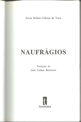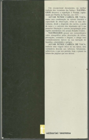 NAUFRÁGIOS. *** Alvar Núñez Cabeza de Vaca *** Tradução de José Colaço Barreiros *** Título original: Naufrágios *** Lisboa: Editorial Teorema, [Sem ind. de ano: 1992 (?) – data do Depósito legal e do Copyright]. Colecção: Américas – [2]. (23,5 x 14,5 cm.) com 143 + [1] pp. Com algumas (poucas) ilustrações a p/b.. Capa flexível. Exemplar razoável. Capa com marcas de manuseamento, alguns vincos (o mais importante no canto superior externo da capa da frente) e um pouco gasta nas margens e na lombada, que apresentam algumas arranhadelas e a perda de pedacinhos da superfície colorida do papel (de muito reduzida importância). Apesar disso, de um modo geral, está ainda bastante apresentável. Páginas globalmente bem conservadas e limpas, embora apresentem um tom ligeiramente amarelecido e algumas pequenas manchas de acidez, que incidem sobretudo nas primeiras, nas últimas e nos cortes. *** Presumível primeira edição portuguesa desta obra, sobre a qual se pode ler na contracapa: «Um excepcional documento, na melhor tradição dos «cronistas das Índias», Naufrágios descreve a expedição à Flórida, capitaneada por Pánfilo de Narváez, em 1527. Alvar Núnez Cabeza de Vaca, numa rara combinação de talento literário e capacidade de observação, relata as suas desventuras, desde a dispersão dos navios, a perda de rumo e o cativeiro dos tripulantes até à sua posterior libertação e penosa peregrinação pelas regiões meridionais dos actuais Estados Unidos. Naufrágios possui um extraordinário valor etnográfico pelas descrições de tribos, povoações, costumes e línguas, e atinge tons verdadeiramente épicos na sua narração de façanhas, calamidades e perigos. Alvar Núnez Cabeza de Vaca, realizou uma viagem única na sua época, uma verdadeira descida aos infernos; felizmente, sobreviveu, o que nos permite, hoje, o prazer da leitura das páginas que nos deixou.» (Na imagem 4 está apenas o começo do índice, que ocupa mais duas páginas). *** Portes: envio gratuito em correio normal (tarifa especial para livros) * envio em correio registado: 1,70