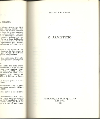 O ARMISTÍCIO. *** Natália Correia *** Lisboa: Publicações Dom Quixote, 1985. Colecção: Autores de Língua Portuguesa – Obras de Natália Correia. (21 x 13,5 cm.) com 73 + [3] pp. Capa flexível. Exemplar razoável. Capa com marcas de manuseamento, algumas manchas ligeiras, pequenas perdas de cor em alguns pontos e um leve desgaste nas margens e na lombada, mas, de um modo geral, ainda em boas condições. Páginas globalmente bem conservadas e limpas, embora apresentem um tom ligeiramente amarelecido e alguns pontinhos de acidez (raros e de muito reduzida importância). *** Primeira edição deste livro que Fernando Dacosta considera «um ousadíssimo poema-ensaio». «Nele, Natália exorta-nos a arrancar Jesus do ignóbil madeiro onde, beatamente, perversamente O mantemos pregado há dois mil anos», «com a finalidade ecuménica da paz universal». «Avanço, pois», escreve a Autora, «apressadamente para a ideia da descrucificação; antes que se gaste a flor do deus anoitecido na cruz. Porque este é o tempo de descobrir o mundo em boas relações com todos os deuses. E ao regresso de todos é devida a piedade, essa sim, cristianíssima, de apearmos o seu doce irmão do suplício que os afugentou. (...) Não reneguemos o zelo com que a vida reclama que os deuses voltem como os pássaros às suas árvores. O seu regresso nos dará sinal da descrucificação.» *** Portes: envio gratuito em correio normal (tarifa especial para livros) * envio em correio registado: 1,70