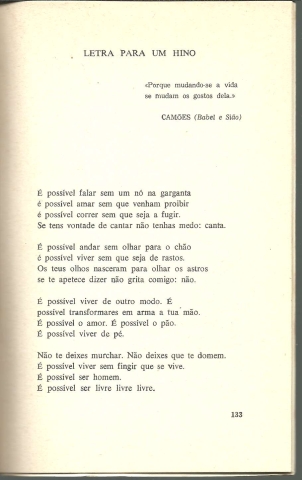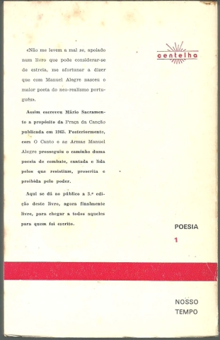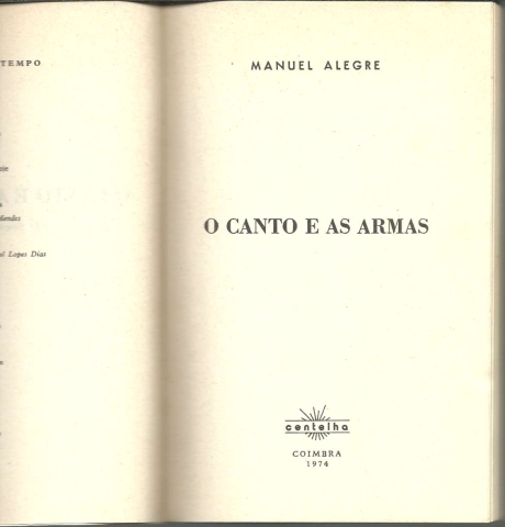 O CANTO E AS ARMAS. *** Manuel Alegre *** Coimbra: Centelha, 1974. Colecção: Poesia – Nosso Tempo – 1. (18 x 11,5 cm.) com 139 + [5] pp. Capa flexível. Exemplar razoável. Capa com marcas de manuseamento, manchas de acidez (também do lado de dentro) e um pequeno desgaste nas margens e na lombada, que apresenta também vincos de abertura. Apesar de algo envelhecida, de um modo geral, está ainda apresentável. Páginas em relativo bom estado, embora se encontrem um pouco amarelecidas e apresentem algumas manchas de acidez, que incidem sobretudo nas primeiras e nas últimas. Quatro folhas consecutivas apresentam-se bastante amachucadas e uma delas até com algumas pequenas manchas de tinta, mas trata-se certamente de uma imperfeição tipográfica. Um poema apresenta curiosas marcas feitas a lápis, que eliminam alguns versos e destacam outros, e que podem ser facilmente apagadas. Tem uma pequena etiqueta de livraria ou distribuidora de livros colada na primeira página. *** 3.ª edição deste livro de poemas de Manuel Alegre que (tal como Praça da Canção) marcou profundamente uma geração de portugueses que, na década de 1960, contestavam o regime salazarista e a guerra nas ex-colónias africanas. Publicado originalmente em 1967, e com ampla circulação clandestina em cópias manuscritas e dactilografadas, vários dos poemas que integram esta obra, rapidamente se popularizaram na voz de importantes cantores, com destaque para Adriano Correia de Oliveira. *** Portes: envio gratuito em correio normal (tarifa especial para livros) * envio em correio registado: 1,70