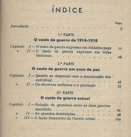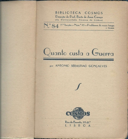 QUANTO CUSTA A GUERRA. *** António Sebastião Gonçalves *** Lisboa: Cosmos, 1945. Colecção: Biblioteca Cosmos – N.º 84; 7.ª Secção – Núm.º 10 – Problemas do nosso tempo, c) Sociais. (19 x 13 cm.) com 140 + [4] pp. Capa flexível. Exemplar razoável. Capa com marcas de manuseamento, algumas manchas, um pouco escurecida e algo gasta nas margens e na lombada, que se encontram também um pouco amachucadas em alguns pontos e apresentam mesmo pequenos rasgões, de muito reduzida importância. Apesar de tudo, de um modo geral, encontra-se ainda em decente estado de conservação. Páginas globalmente bem conservadas e limpas, mas amarelecidas e com algumas manchas de acidez (raras). Algumas folhas apresentam também irregularidades nas margens por terem sido abertas de maneira descuidada. *** Primeira edição deste estudo que procura essencialmente avaliar as consequências financeiras e económicas da guerra, tendo como referências fundamentais as duas Grandes Guerras Mundiais. (Índice na imagem 4). *** Portes: envio gratuito em correio normal (tarifa especial para livros) * envio em correio registado: 1,70