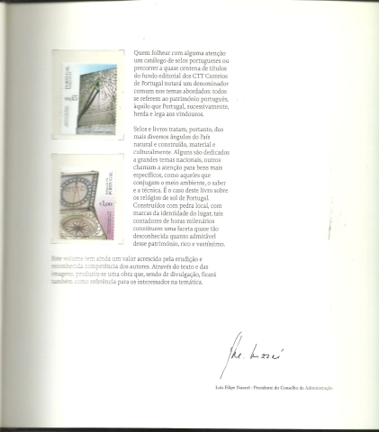 RELÓGIOS DE SOL. *** Nuno Crato – Suzana Metello de Nápoles – Fernando Correia de Oliveira *** Levantamento iconográfico de Jorge Correia Santos *** Design: Eduardo Aires *** [Texto de apresentação]: Luís Filipe Nazaré [Presidente do Conselho de Administração] *** [Lisboa]: Edição do Clube do Coleccionador dos Correios, 2006. (24,5 x 24,5 cm.) com 171 + [1] pp. Com muitas ilustrações a cores e a p/b.. Capa dura. Exemplar razoável. Capa com marcas de manuseamento, manchas muito ligeiras e um pequeno desgaste nas margens e na lombada, apresentando ainda pequenas áreas superficialmente roídas pela traça (com reduzido impacto no aspecto geral), mas, de um modo geral, ainda em boas condições e limpa. Páginas bem conservadas e limpas. Tem, no entanto, no rosto, aquilo que julgo ser um curioso carimbo/ex-líbris. *** Primeira edição deste livro sobre os relógios de sol em Portugal «Construídos com pedra local», escreve Luís Nazaré, «com marcas de identidade do lugar, tais contadores de horas milenários constituem uma faceta quase tão desconhecida quanto admirável desse património rico e vastíssimo. Este volume tem ainda um valor acrescido pela erudição e reconhecida competência dos autores. Através do texto e das imagens, produziu-se uma obra que, sendo de divulgação, ficará também como referência para os interessados na temática.» Exemplar numerado e contendo dois selos e um bloco autenticado e numerado da emissão filatélica “O Sol”, de 3 de Outubro de 2005. Impresso em bom papel e de cuidada apresentação gráfica, como é característico desta edições. *** Portes: envio gratuito em correio normal (tarifa especial para livros) * envio em correio registado: 1,70