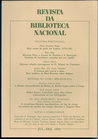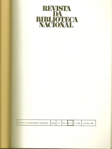REVISTA DA BIBLIOTECA NACIONAL. [Série] 2 – Vol. 7 – N.º 2 – Jul.-Dez. 1992. *** Director: António Braz de Oliveira *** Secretário de Redacção: Carlos Abreu *** Conselho Editorial: Isabel Vilares Cepeda – João Rui de Sousa – Manuela D. Domingos – Maria Luísa Cabral – Maria Valentina Mendes *** Processamento de texto: Zélia Castro *** Revisão: Fátima Alves *** Lisboa: Biblioteca Nacional, 1992. (24,5 x 17 cm.) com 228 + [4] pp. Com várias ilustrações a p/b. + [3] folhas que funcionam como separadores das secções em que a revista está organizada. Capa flexível. Bom exemplar. Capa com ligeiras marcas de manuseamento, encontrando-se bem conservada e limpa. Páginas em bom estado e limpas. *** Segundo número do sétimo volume da segunda série da Revista da Biblioteca Nacional, de periodicidade semestral, correspondendo ao período Julho a Dezembro de 1992. Inclui vários trabalhos inéditos sobre a Cultura Portuguesa dos séculos XVI, XIX e XX, assim como estudos de bibliografia, biblioteconomia e história do livro. Tiragem declarada de 1000 exemplares. *** Portes: envio gratuito em correio normal (tarifa especial para livros) * envio em correio registado: 1,70