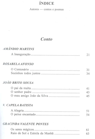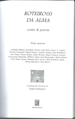 ROTEIRO(S) DA ALMA. Conto & Poesia. *** Vinte Autores – Amândio Martins; Rosabela Afonso; João Brito Sousa; V. Capela Batista; Gracinda Valente Pontes; Arnaldo Guedes; Sara Madaleno; João Gama; Teresa Santos; Isabel Rosete; Sérgio Fonseca; Leonor Bettencourt Bernardo; JCPáris; Paula; José Branquinho; Maria Helena Dinis Prata Tomás; Manuela Silva Neves; Júlia Brimbela; Maria Albina Martinho; Célia Bastos *** Coordenação literária de Ângelo Rodrigues *** Lisboa: Editorial Minerva, 2009. (21 x 13,5 cm.) com 218 + [6] pp. Com algumas ilustrações a p/b.. Capa flexível, com badanas. Bom exemplar. Capa com marcas de manuseamento, alguns vincos discretos e um ligeiro desgaste nas margens, mas, de um modo geral, ainda em bom estado e limpa. Páginas bem conservadas e limpas. *** Primeira edição desta colectânea de conto e poesia de vinte diferentes autores, que dá sequência a um projecto da Editorial Minerva que, sob diferentes títulos, havia já editado anteriormente mais de uma dezena e meia destas colectâneas, onde procurava dar voz a autores pouco conhecidos ou mesmo inéditos. (Na imagem 4 está apenas o começo do índice, que ocupa mais duas páginas). *** Portes: envio gratuito em correio normal (tarifa especial para livros) * envio em correio registado: 1,70