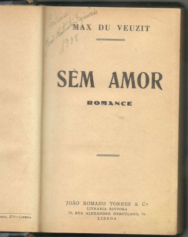 SEM AMOR. Romance. *** Max du Veuzit *** Esta obra, no original francês tem o título La petite comtesse *** Lisboa: João Romano Torres & C.ª – Livraria Editora, [Sem ind. de ano: muito provavelmente da segunda metade da década de 1930]. (19 x 12 cm.) com 311 + [1] pp. Encadernado, sem conservar a capa original. Exemplar razoável. Encadernação com lombada e cantos em pele preta, tendo as pastas recobertas por percalina azul; na lombada (lisa), tem gravados a ouro o nome da Autora, o título e motivos ornamentais (falsos nervos e florões). Encadernação em mau estado, envelhecida, com fortes marcas de uso, algumas manchas, um pouco descolorida em alguns pontos e gasta nas margens e na lombada (que apresenta furos de bicho e esfoladelas), tendo ainda algumas pequenas áreas roídas pela traça. Também a percalina se encontra gasta nas margens, com alguns rasgões e a a falta de alguns pedaços. Páginas globalmente bem conservadas e limpas, mas amarelecidas e com algumas manchas (pouco frequentes). No canto superior esquerdo do rosto tem, no entanto, uma inscrição manuscrita de posse. Em suma: exemplar bom para leitura, mas algo cansado e não muito atraente. *** Presumível primeira edição portuguesa deste romance de sentimentalismo intenso, onde se misturam conflitos de classe, emoções profundas e emancipação feminina, na linha das obras que granjearam à sua Autora, de seu verdadeiro nome Alphonsine Vavasseur, uma enorme popularidade no seu tempo (e particularmente na década de 1930), com os seus livros a serem continuamente reeditados e traduzidos em várias línguas. Em sua homenagem e realçando esta qualidade de best seller de Max du Veuzit, foi criado um prémio literário com o seu nome, que era atribuído ao autor do romance que mais exemplares vendesse nos quatro anos anteriores. *** Portes: envio gratuito em correio normal (tarifa especial para livros) * envio em correio registado: 1,70