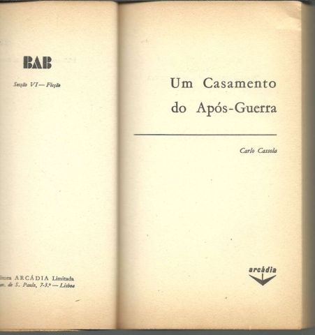 UM CASAMENTO DO APÓS-GUERRA. *** Carlo Cassola *** Título original: Un Matrimonio del Dopoguerra *** Tradução de Mário Delgado *** Lisboa: Editora Arcádia Limitada, 1965. Colecção: BAB – Biblioteca Arcádia de Bolso – 41; Secção VI – Ficção. (18 x 10,5 cm.) com 210 + [6] pp. Capa flexível. Exemplar razoável. Capa com marcas de manuseamento, alguns pequenos vincos, manchas ligeiras e um leve desgaste nas margens, mas, de um modo geral, ainda em boas condições e limpa. Páginas globalmente bem conservadas e limpas, embora apresentem um tom amarelecido (um pouco mais forte nas margens) e algumas pequenas manchas de acidez. No anterrosto tem uma pequena área um pouco gasta, onde provavelmente foi apagada alguma inscrição ou assinatura, mas que passa algo despercebida a um primeiro olhar. *** Primeira edição portuguesa desta novela, originalmente publicada em 1957, que tem por pano de fundo a vida turbulenta do pós-guerra em Itália, marcada por problemas económicos, conflitos políticos e desajustamentos familiares. Capa e arranjo gráfico de Sebastião Rodrigues. *** Portes: envio gratuito em correio normal (tarifa especial para livros) * envio em correio registado: 1,70