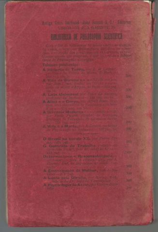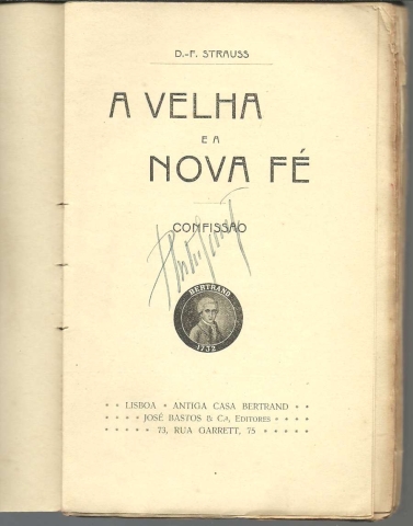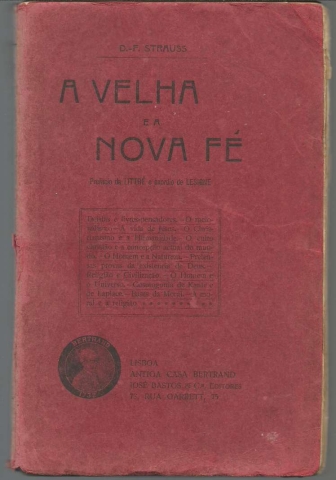 A VELHA E A NOVA FÉ. [Deistas e livres-pensadores. – O racionalismo. – A vida de Jesus. – O Christianismo e a Humanidade. – O culto christão e a concepção actual do mundo. – O Homem e a Natureza. – Pretensas provas da existencia de Deus. – Religião e Civilização. – O Homem e o Universo. – Cosmogonia de Kante e de Laplace. – Bases da Moral. – A moral e a religião.] *** D.-F. Strauss *** Prefacio de Littré e exordio de [Ernesto] Lesigne *** Lisboa: Antiga Casa Bertrand – José Bastos & C.ª, Editores, [Sem ind. de ano: c. de 1910]. (19 x 12,5 cm.) com 358 + [2] pp. Capa flexível. Exemplar razoável. Capa envelhecida, com evidentes marcas de manuseamento, manchas, vincos, um pouco descolorida em alguns pontos, ligeiramente empoeirada e gasta nas margens e na lombada, que se apresenta mesmo um pouco danificada, com rasgões e algumas áreas amachucadas. Páginas, de um modo geral, bem conservadas e limpas, embora apresentem um tom amarelecido e algumas pequenas manchas (pouco frequentes e pouco importantes), tudo próprio do papel e da passagem do tempo. Tem, no entanto, uma assinatura de posse no rosto e a falta de um pedaço de papel no canto superior externo da primeira página (sem qualquer prejuízo para a parte impressa). *** Primeira edição portuguesa desta obra a propósito da qual escreve, no exórdio, retirado da edição francesa, E. Lesigne, responsável pela tradução para aquele idioma: «Muito me apraz que a livraria Schleicher, proseguindo na sua obra de educação scientifica e social, apresente hoje ao grande publico, cada vez mais ávido de conhecimentos objectivos, uma nova edição das paginas mundiaes em que o celebre David-Frederico Strauss, de começo partilhando a fé religiosa, sendo depois padre, professor de seminario, e, pelo decorrer do proprio ensino, determinado a convencer-se da falsidade dos dogmas christãos, e a demonstrar em seguida, tal falsidade na sua famosa Vida de Jesus, se elevou finalmente, como remate á sua leal existencia de estudo, á fé nova, a fé segundo a sciencia, á concepção e descripção totalmente, puramente scientica do universo, incluindo o homem.» O Autor, David Friedrich Strauss, foi um controverso filósofo e teólogo alemão, que abriu novos caminhos na interpretação bíblica, que lhe valeram inimizades, ataques e mesmo a expulsão dos círculos académicos teológicos. Nesta obra, cuja publicação culminou a sua odisseia religiosa, aventurou-se a substiuir o cristianismo pelo materialismo científico. Muito criticado por uma alegada compreensão inadequada dos textos bíblicos que criticou, Strauss, no entanto, não apenas influenciou as escolas liberais e escatológicas do pensamento bíblico do século XX, como também estimulou os estudiosos que lhe sucederam na busca pelo “Jesus histórico”. Nada vulgar. *** Portes: envio gratuito em correio normal (tarifa especial para livros) * envio em correio registado: 1,70