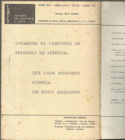 VÉRTICE. Revista de Cultura e Arte. Volume XXXIV – Número 370-371 – Nov.-Dez. – Coimbra, 1974. *** Director: Raul Gomes *** [Vários Autores] *** Coimbra: Vértice, Empresa Jornalística, S. A. R. L., 1974. (Composta e impressa na Tip. da «Atlântida» – Pedrulha – Coimbra). (22 x 16 cm.) com [108] pp. (numeradas de [1]-830 a 936). Com algumas ilustrações a p/b.. Capa flexível. Exemplar razoável. Capa com marcas de manuseamento, algumas manchas, vincos e um pouco gasta nas margens e na lombada, que apresenta mesmo alguns pequenos rasgões, embora sem faltas de papel. A contracapa apresenta um corte superficial, em diagonal, mais ou menos no centro, mas que não a trespassa. Apesar de tudo, de um modo geral, está ainda bastante apresentável. Páginas bem conservadas e limpas, embora apresentem um tom amarelecido, próprio do papel e uma ou outra pequena mancha (raras).*** Número duplo da revista Vértice, publicação que marcou de forma indelével a cultura portuguesa do século XX. (Sumário na imagem 4). *** Portes: envio gratuito em correio normal (tarifa especial para livros) * envio em correio registado: 1,70