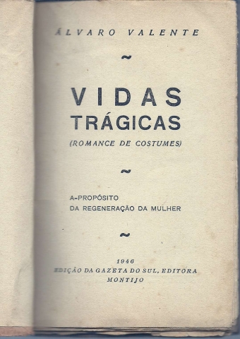 VIDAS TRÁGICAS. (Romance de Costumes). A-propósito da Regeneração da Mulher. *** Álvaro Valente *** Montijo: Edição da Gazeta do Sul, Editora, 1946. (19,5 x 12,5 cm.) com 288 pp. Capa flexível. Exemplar razoável. Capa com evidentes marcas de uso, manchas, empoeirada e gasta e amachucada nas margens e na lombada, onde apresenta alguns pequenos rasgões e mesmo a falta de alguns pedacinhos de papel. Páginas, de um modo geral, em bom estado, mas amarelecidas e com algumas manchas de acidez. Várias folhas apresentam também pequenas irregularidades nas margens, por terem sido abertas de maneira poucio cuidadosa. Tem um carimbo no anterrosto, que indicia que este exemplar terá servido de prémio num concurso promovido pela Gazeta do Sul. *** Primeira edição deste romance centrado no problema da prostituição feminina, no qual o Autor, apesar de favorável, se mostra algo céptico quanto à possibilidade de regeneração sistemática das mulheres que a praticam. Como escreve o Autor, nas Palavras Finais, «antes quereria glorificar a regeneração da mulher, em bases duma possibilidade sempre certa e matemática. Isto era o que o meu velho espírito de impenitente sonhador me ditava. Mas a minha observação e a minha acuidade prática disseram-me que, se eu seguisse essa trajectória, falsearia a verdade.» (...) «O Destino e o Homem continuarão estigmatizando, impertérritos e sem piedade, as mulheres que caiam nos atoleiros e bebam o tóxico embriagador das orgias asquerosas. Só com uma assistência efectiva, contínua, refundindo o ambiente desde os alicerces, educando e instruindo persistentemente, amparando e levantando, protegendo a criança e vigiando a mulher, se colherão resultados. O meu livro foi, pois, um diletantismo espiritual, um grito nas escuridões, um rasgão de luz que a minha inteligência trazia há muito em concentração e a que era indispensável êste desabafo. Provo, ao menos, que estudo os magnos problemas sociais, que me preocupo com o mal para o combater, e que sigo a estrada dos meus maiores no culto dos bons sentimentos, dos horizontes mais radiantes.» Invulgar. *** Portes: envio gratuito em correio normal (tarifa especial para livros) * envio em correio registado: 1,70