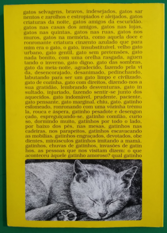 Histórias de gatos domésticos. Histórias de gatos selvagens. Desde que nascem, começam a andar, a utilizar o caixote da areia, a esconder-se, a brincar, enrolados ou lânguidos, a preguiçar ao sol. Mimados. Assustados. Uns respondem pelo nome, Rufus, o Bispo Butckin, outros referem-se pelas cores, a gata cinzenta, o gato preto. As inquietações das idas ao veterinário. A partilha das nossas vidas. Afinal, eles ficam às vezes horas a "vigiar-nos": "Fazer a cama, varrer o chão, fazer ou desfazer uma mala, coser, tricotar - qualquer coisa, observam e vigiam. Mas o que vêem?"