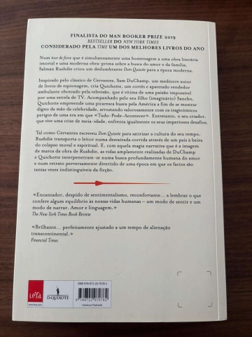 Tal como Cervantes escreveu Dom Quixote para satirizar a cultura do seu tempo, Rushdie transporta o leitor numa desvairada corrida através de um país à beira do colapso moral e espiritual. E, com aquela magia narrativa que é a imagem de marca da obra de Rushdie, as vidas amplamente realizadas de DuChamp e Quichotte interpenetram-se numa busca profundamente humana do amor e num retrato perversamente divertido de uma época em que os factos são tantas vezes indistinguíveis da ficção.