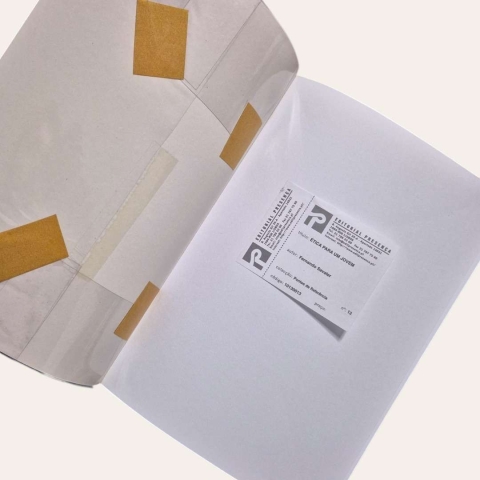 A capa está forrada com uma película transparente; pequenos pedaços de fita adesiva prendem-na ao interior da capa.