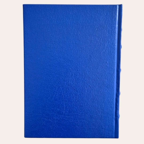 Edição de capa dura azul com detalhes a dourado.