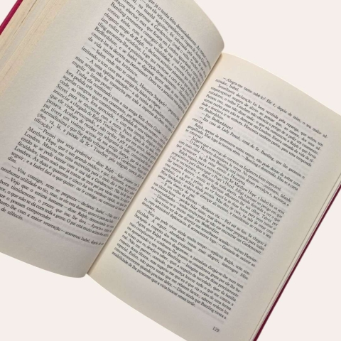 Edição de capa dura encarnada com vários detalhes a dourado.