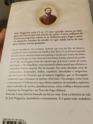 Fez-se marinheiro nos oceanos, homem nas ruas do Rio de Janeiro, caçador de lobos-marinhos no Pacífico Sul. Teria dezanove ou vinte anos quando decidiu lançar amarras numa terra gelada e varrida por ventos do diabo, sem serventia que se visse. Essa terra era Punta Arenas, para lá do paralelo 53 Sul, na margem norte do estreito que já levava o nome de outro português, o de Magalhães. Foi nesta desolada terra de aventureiros, desterrados, índios, caçadores, deserdados e imigrantes, um território de fronteira que já somava tragédias, que «o Português» construiu casa e fortuna e se tornou «Don José». Esta não é uma história baseada em factos reais. Esta é a história da vida de José Nogueira, marinheiro e terratenente. E é quase toda verdadeira.
