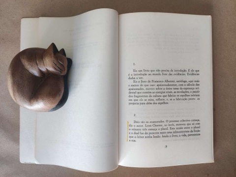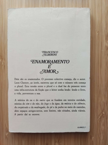 «O que é o enamoramento? É o estado nascente de um movimento coletivo a dois. Esta definição podia ser dada após a conclusão de um longo exame dos factos e de interpretações, mas preferi situá-la no princípio, de modo a que nos sirva de guia nesta breve viagem num mundo de todos conhecido, porque todos o vivemos por experiência direta, apesar de tão enigmático e transitório. (…) O enamoramento não é um fenómeno quotidiano, uma sublimação da sexualidade ou um capricho da imaginação, nem tão-pouco um sentimento sui generis inefável, divino ou diabólico, antes pode ser inserido numa classe de fenómenos já conhecidos, os movimentos coletivos. Entre estes tem certamente a sua individualidade muito própria, (... visto que) nasce apenas entre duas pessoas, e o seu horizonte de dependência, qualquer que seja o valor universal que possa desencadear, está vinculado ao facto de ser completo com duas únicas pessoas. Este é o motivo da sua especificidade, da sua singularidade, o que lhe confere algumas características inconfundíveis.» (do Capítulo Primeiro). Para ler sozinho/a, ou a dois.